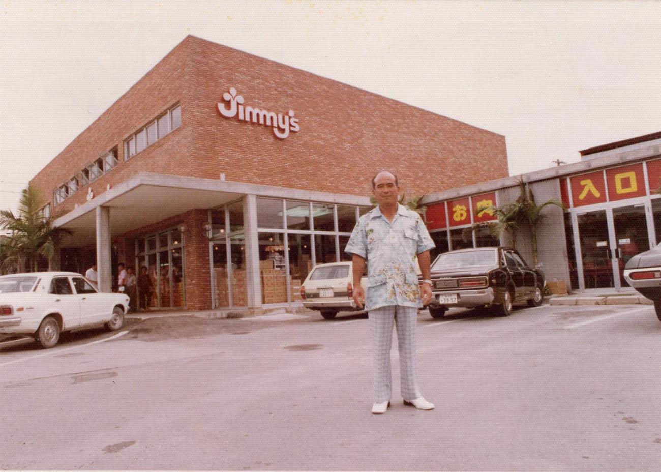 その後、盛保さんは洗車サービスをしたり、食肉卸会社や商社に勤務しながら独立・起業準備を進める。そして軍用1号線(現国道58号線)沿い、今の大山店の道向かい付近に小さなマチャーグヮー(雑貨店)<ジミーグロセリー>をオープン。創業年の1956年は会社組織になった年だが、その数年前(不詳)のこのマチャーグヮーの開業が、<ジミー>の出発点だ。