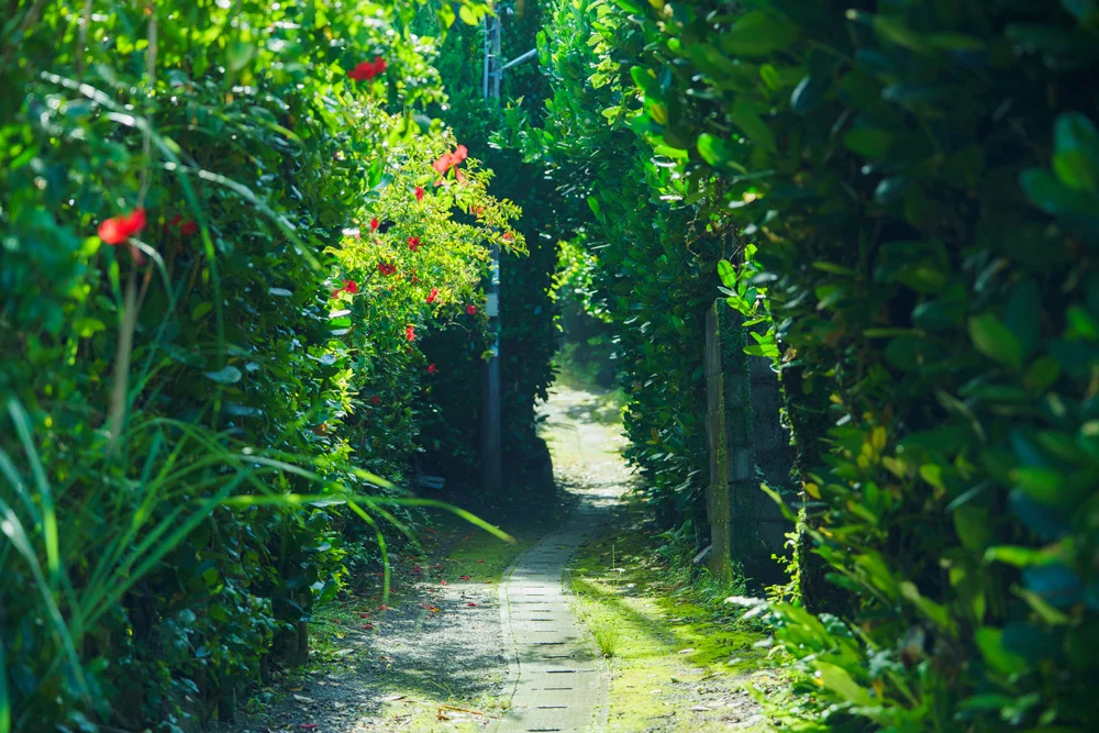 In a quiet Yambaru village of just 26 residents, guests from Japan and abroad come to experience Okinawa’s untouched scenery. People come here to immerse themselves in the tranquil, maze-like village, where narrow Fukugi-lined paths keep cars at bay, and to interact with the local people.