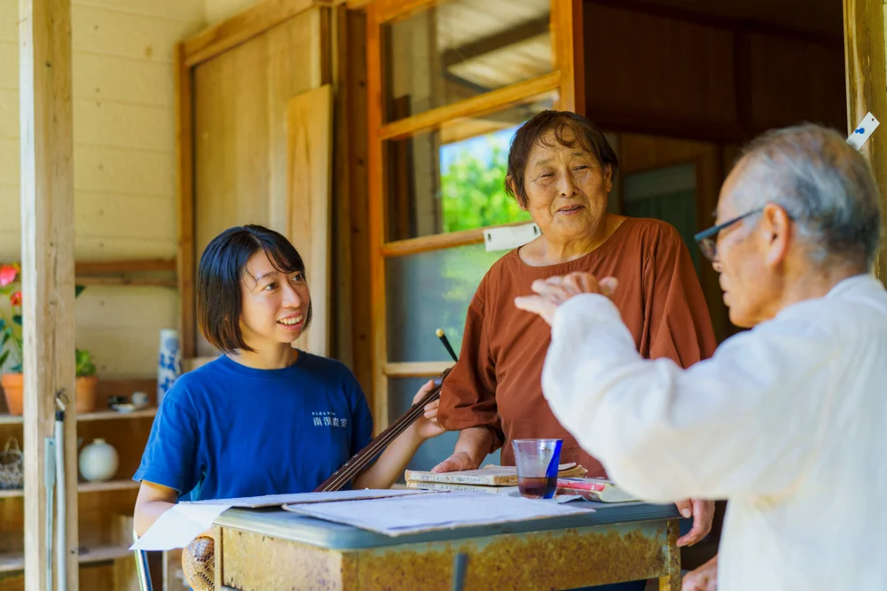 Along with Uehara, two key figures in local residents welcoming guests to the village are Yoshihide and Sayuri. Yoshihide, a talented Sanshin (traditional Okinawan instrument) player who enjoys practicing English, often offers Sanshin lessons and chats with international visitors.