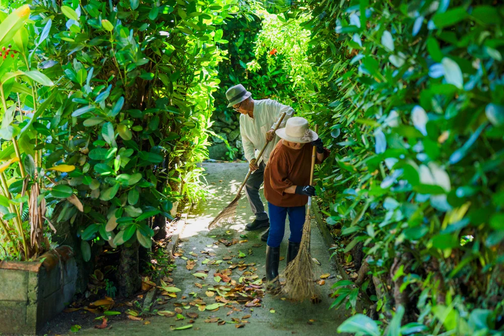 When Uehara lets him know guests are coming, Yoshihide sometimes plays the Sanshin from his veranda, creating a welcoming atmosphere. He and Sayuri also sweep the Fukugi-lined paths to prepare for their arrival. “It’s incredible to have people from all over the world visit our little village. We really enjoy it,” they say.